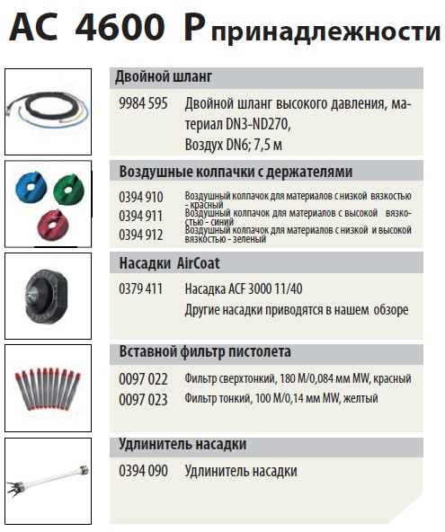Комплектуется AIR COAT 4600 воздушным колпачком, предназначенным для материалов средней вязкости и материалов на растворителе. В зависимости от цвета колпачка, возможно изменение свойств факела и качества распыления материала.